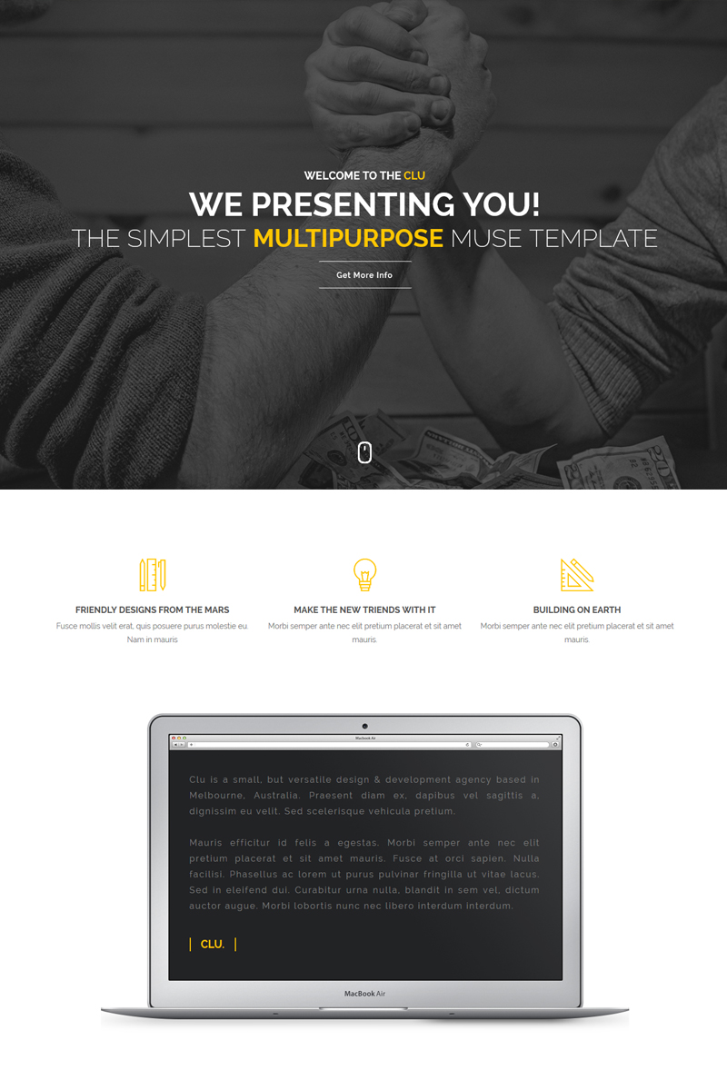 Muse шаблон 2021 года - Clu - Creative Multipurpose Muse Template, отлично подойдет для сайтов в сфере Развлечения.
