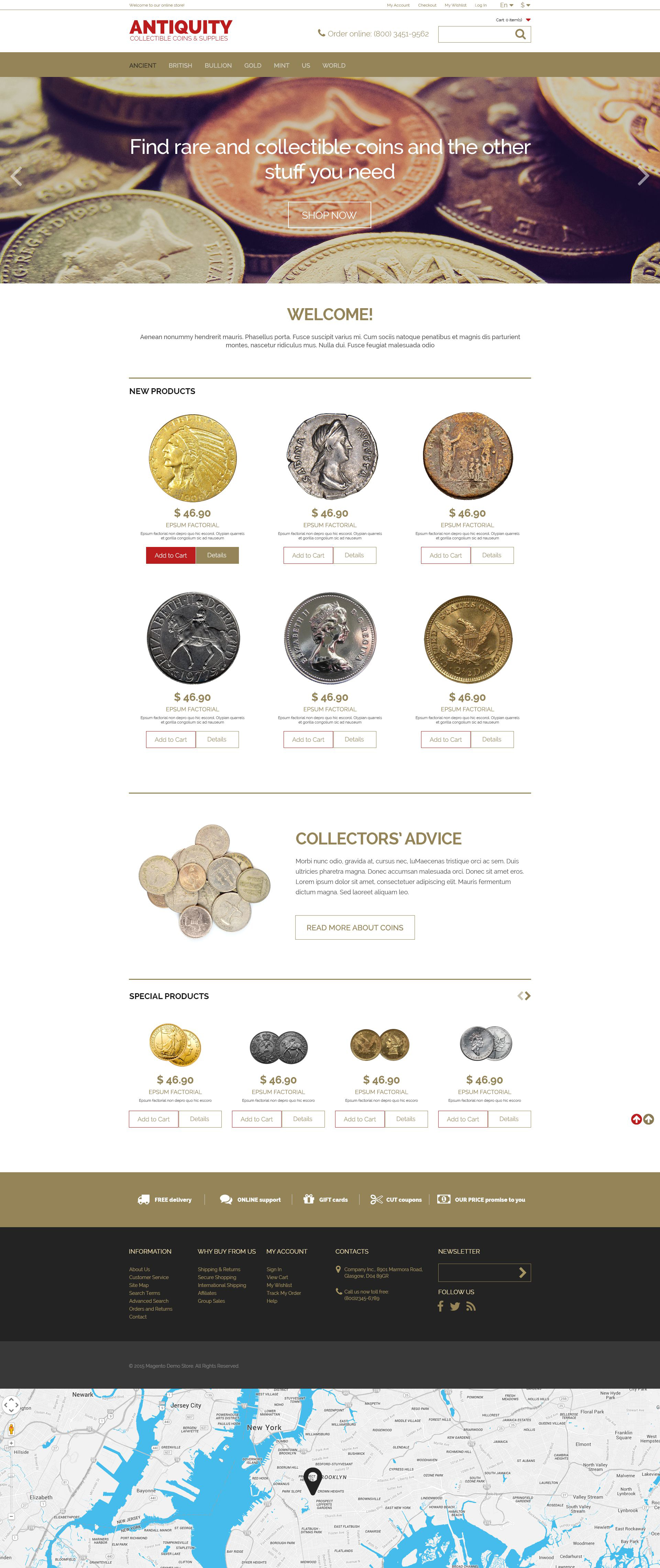 Magento эффектный шаблон - Antique Store - Collectible Coins Magento Theme, идеально подходит для сайтов в сфере Магазин антиквариата.