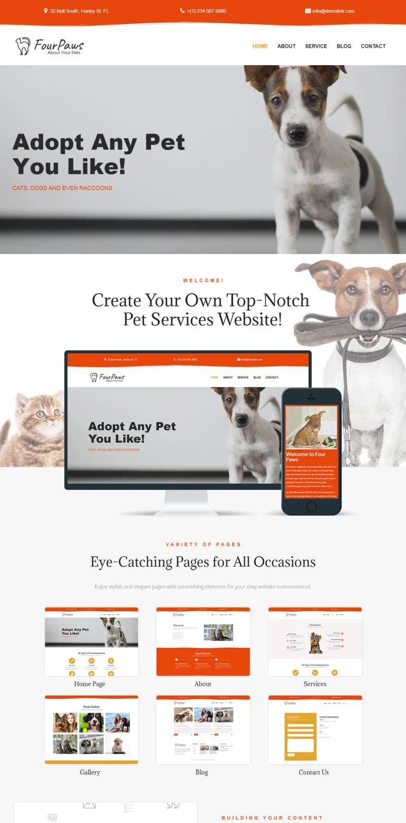 WordPress шаблон для сайта - Four Paws - Pet Services Multipurpose Classic WordPress Elementor Theme, подходит для сайтов в области Приют для животных.