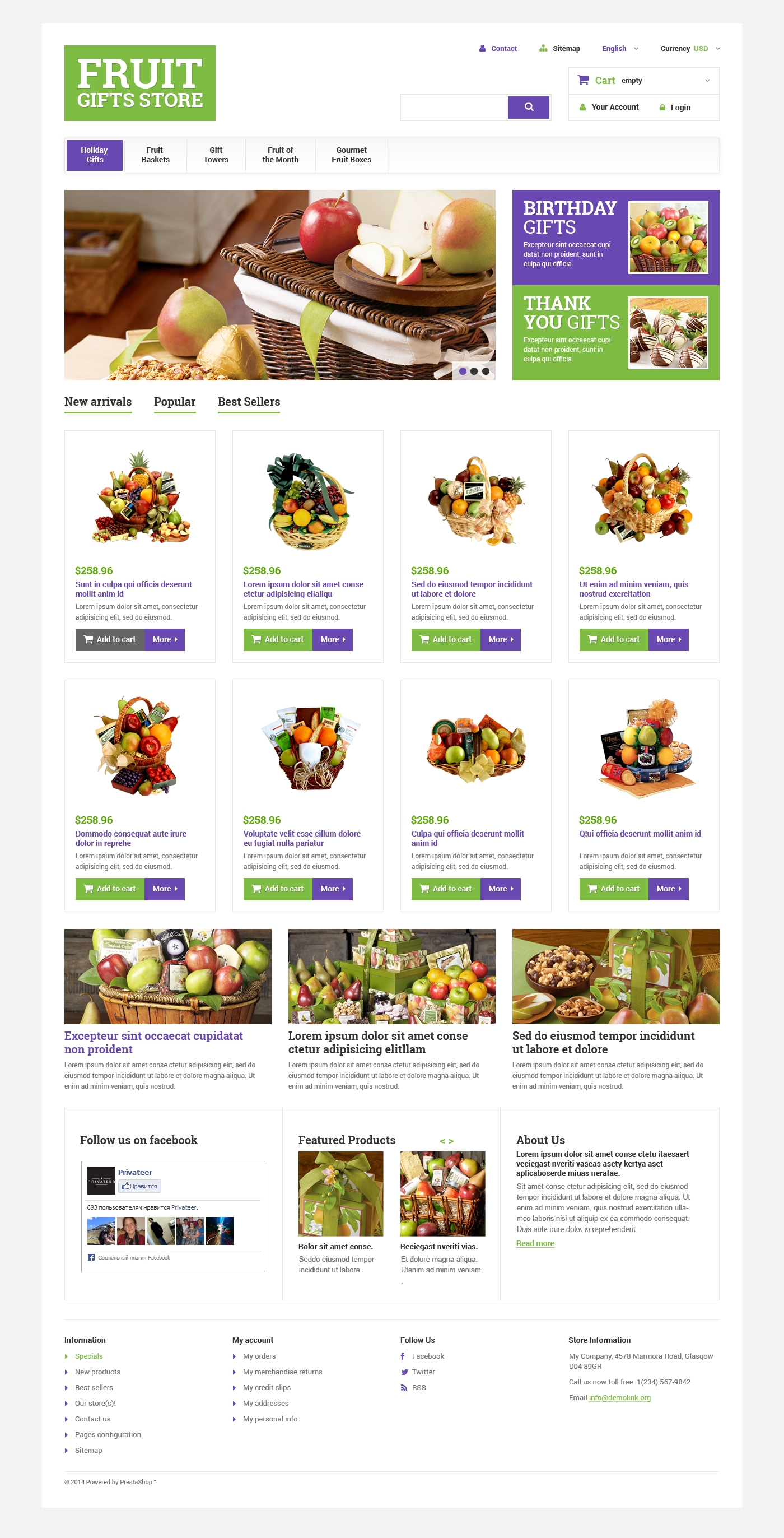 Gifts Store - хорошо подходит для сайтов Магазин подарков. PrestaShop шаблон для сайта интернет-магазина - Fruit Gift Baskets PrestaShop Theme.