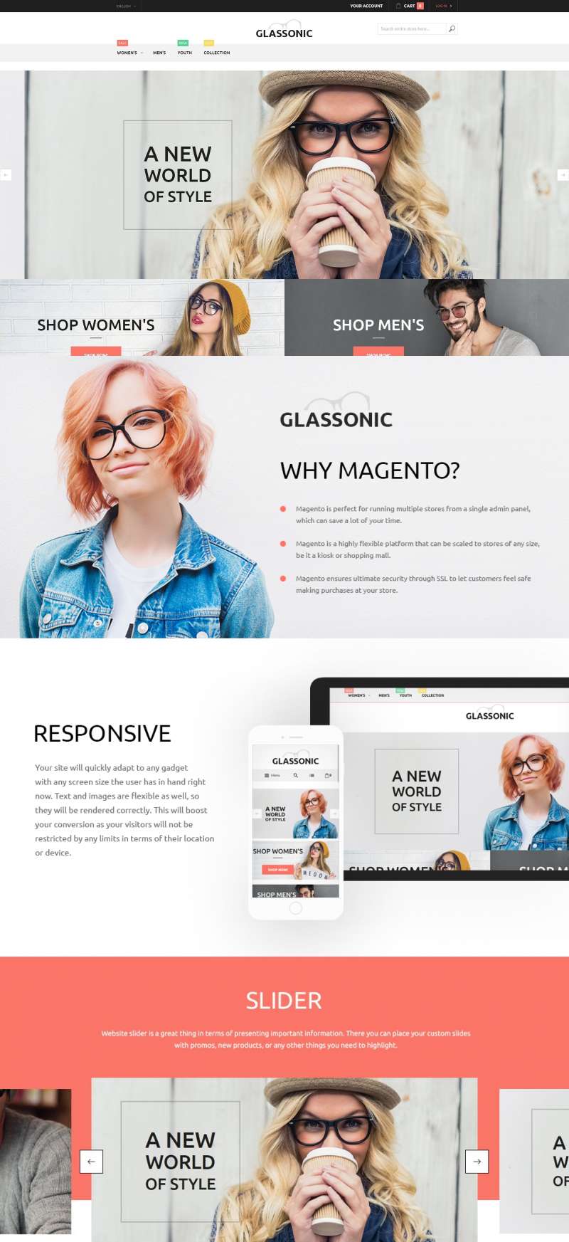 Eye Glasses - превосходно подходит для сайтов в сфере Солнцезащитные очки. Magento шикарный шаблон - Glassonic Magento Theme.