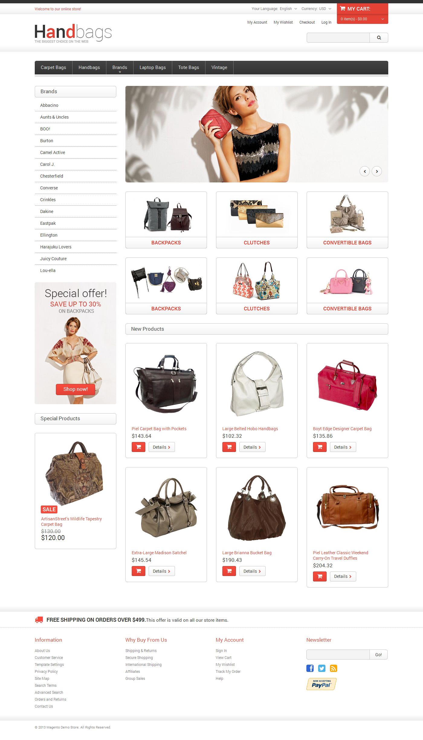 Handbag - идеально подойдет для сайтов на тему Магазин сумок. Magento шикарный шаблон - Handbag Responsive Magento Theme.