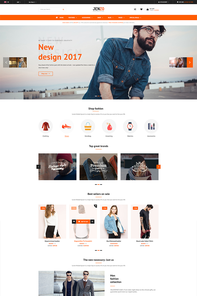 Jenzo - хорошо подходит для сайтов в сфере Модный магазин. Magento шикарный шаблон - Multipurpose Premium Magento Theme.
