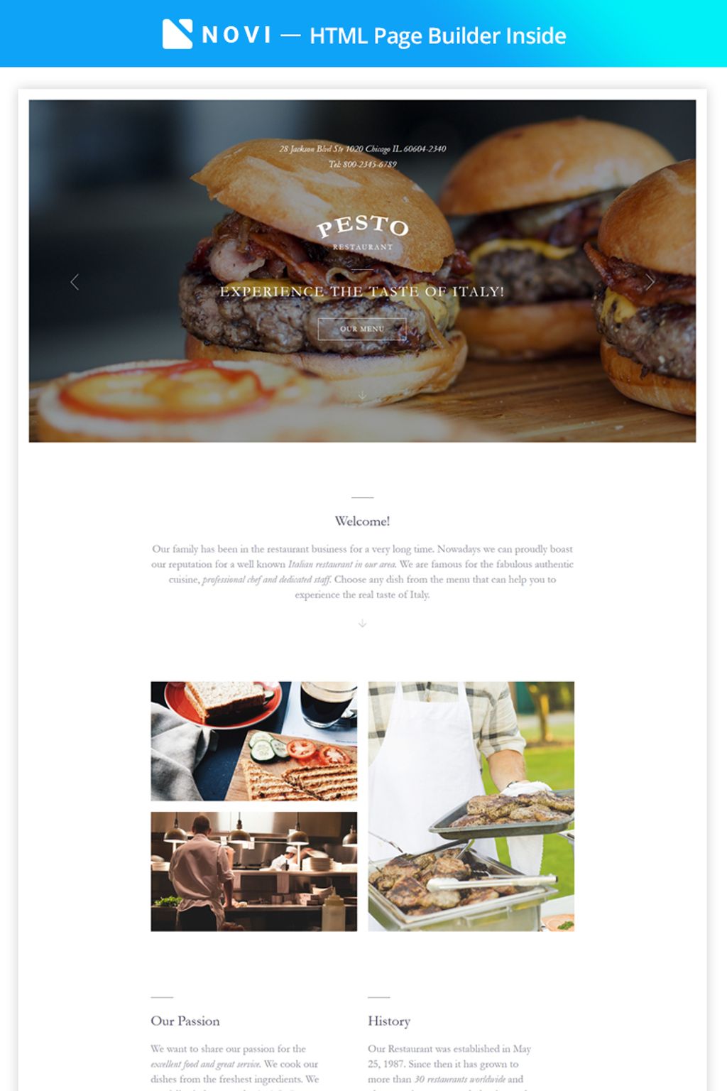 Лендинг шаблон одностраничника - Pesto - Elegant Restaurant Template Compatible with Novi Builder Landing Page Template, хорошо подходит для сайтов на тему Итальянский ресторан.