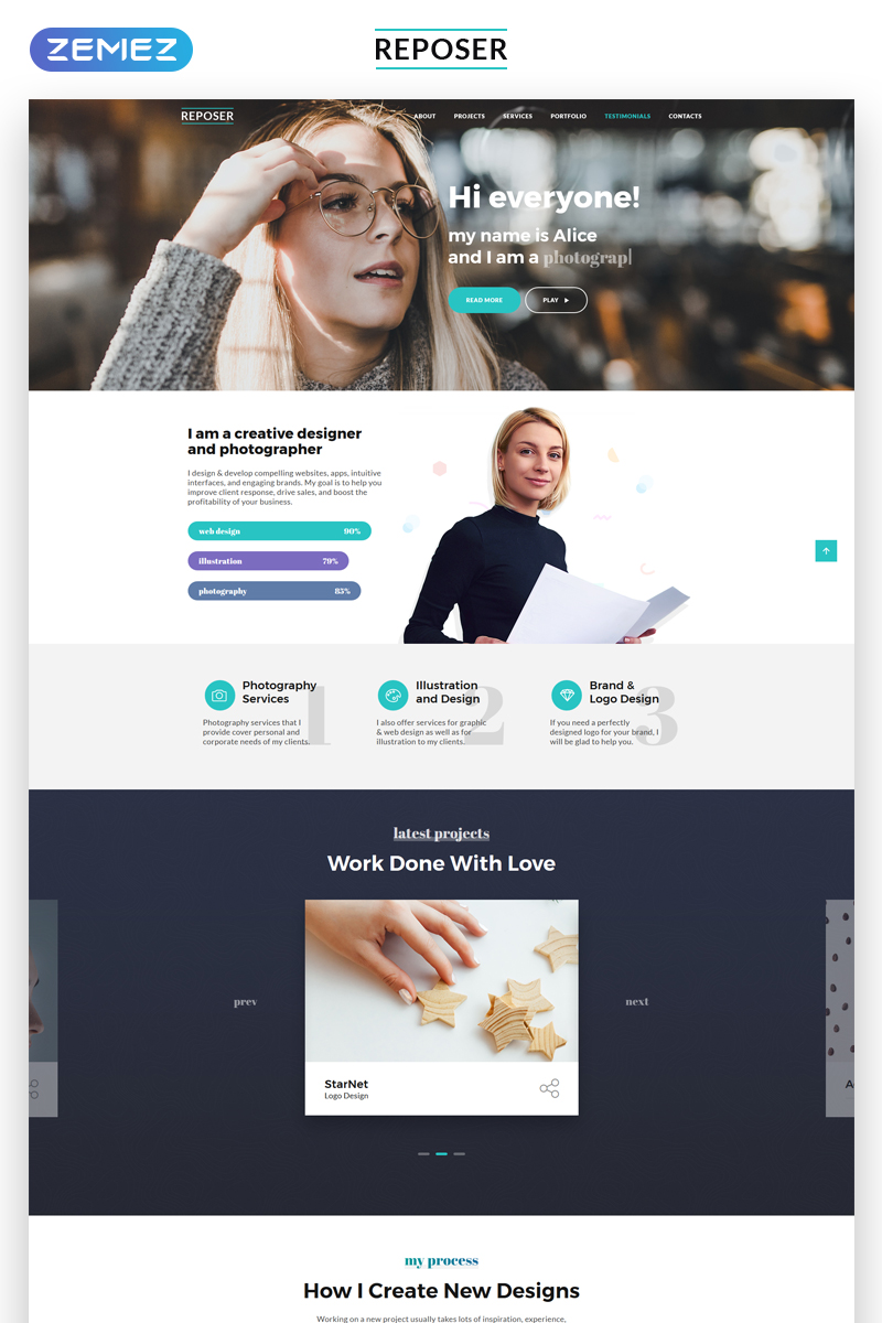 Лендинг шаблон одностраничного сайта - Reposer - Catching Portfolio HTML Landing Page Template, отлично подходит для сайтов на тему Фотогалерея.