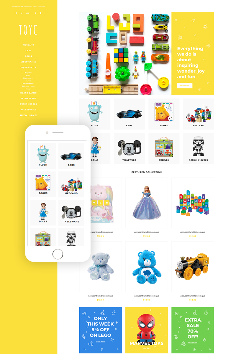 Toyc - хорошо подходит для сайтов на тему Детские игрушки. Shopify шаблон для интернет-магазина - Toy Store Clean Shopify Theme.