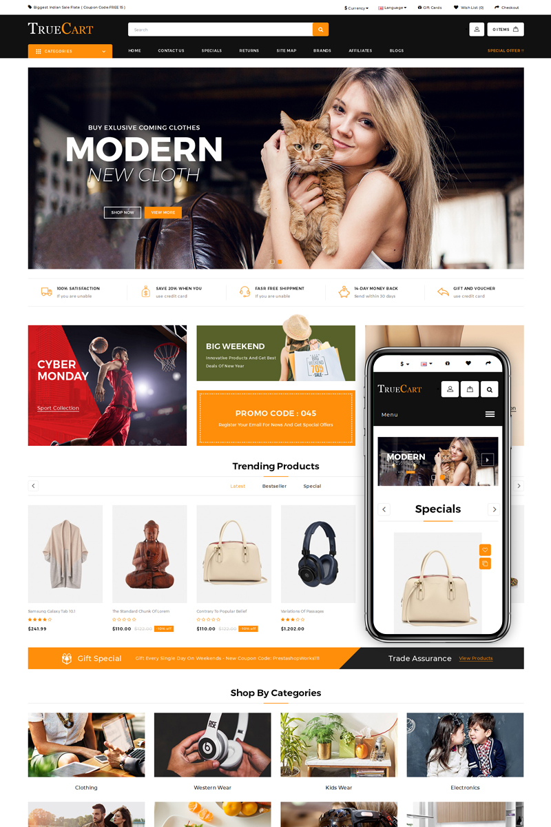 Electronics - специально для сайтов в области Электроника. OpenCart интернет-магазин для сайта - TrueCart multipurpose OpenCart Template.