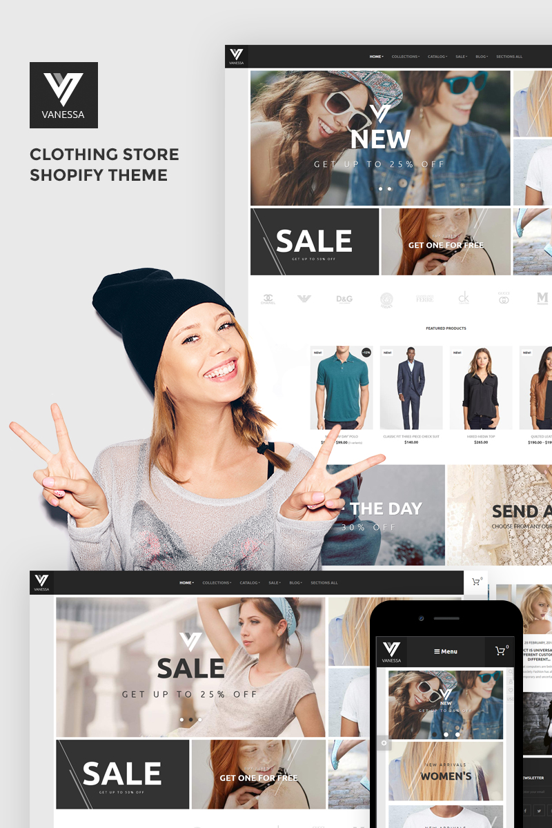Vanessa - идеально подходит для сайтов в сфере Мода. Shopify шаблон для интернет-магазина - Clothing Store Shopify Theme.